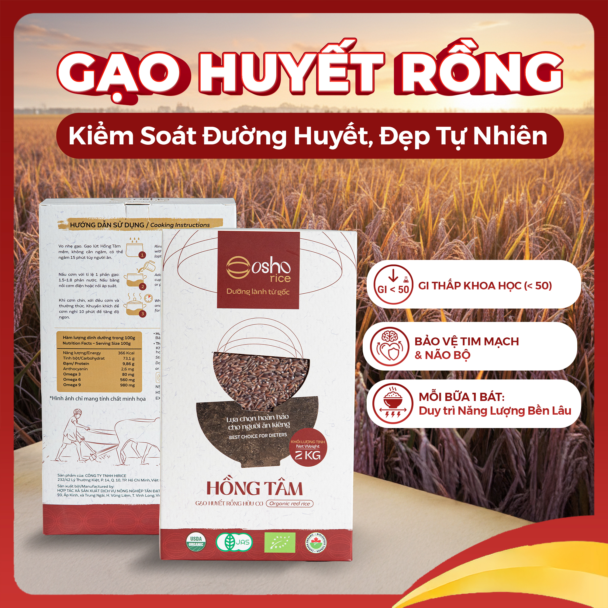 Hồng Tâm là gạo huyết rồng hữu cơ được HiRice cùng bà con hợp tác xã chọn lọc từ những cánh đồng lúa chuẩn hữu cơ canh tác giống lứt đỏ SR20 của các kỹ sư nông nghiệp Việt Nam nghiên cứu phát triển. Gạo lứt huyết rồng giàu chất xơ, v, omega- giúp bảo vệ tim mạch và hỗ trợ não bộ. Mỗi bữa ăn với Hồng Tâm là một trải nghiệm dinh dưỡng cân bằng, giúp duy trì năng lượng bền lâu.